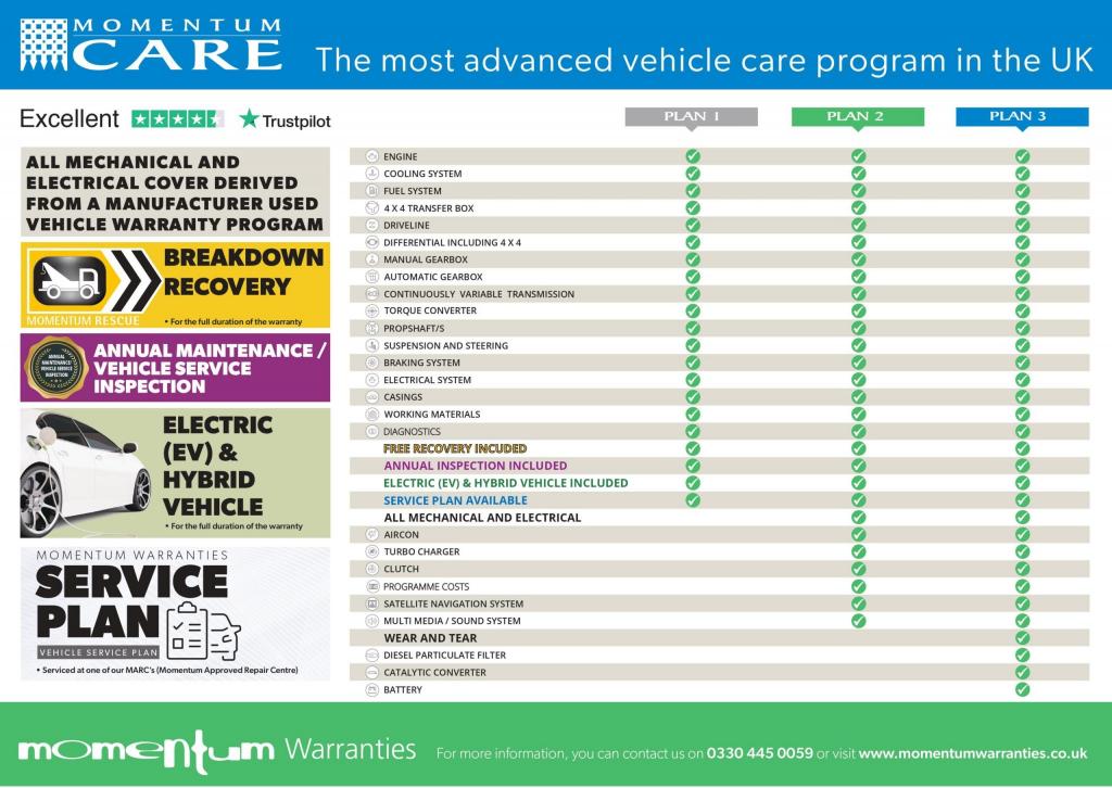- Insurance based warranty provided by Momentum Warranties with free breakdown cover . These are definitely handy if you have travelled some distance to purchase you new vehicle. These 6 months warranties are included in the price if the car is eligible. However longer periods of cover are available at a small cost to the customer.
